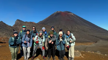 Photo, credit Margaret Hinkle: Hinkle with students hiking the Tongariro Crossing in Aotearoroa/New Zealand for my spring term class- Regional Geology of New Zealand.
